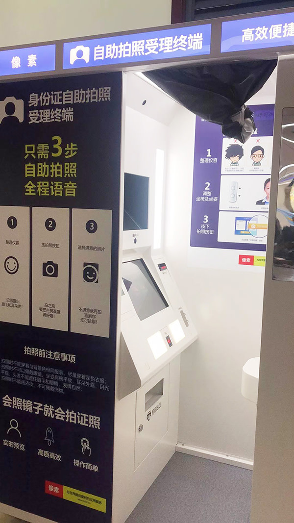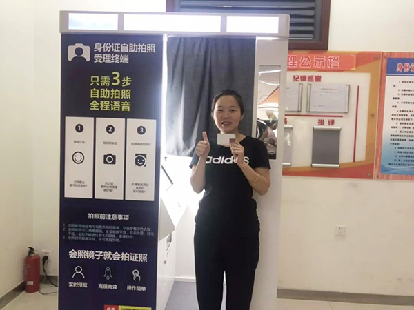 身份证自助拍照一体机集合了自助拍照和自助办证两大模块,支持居民身份证的到期更换和丢失补办,全程语音提示,办证人可自行按照屏幕和语音提示,按照选择业务类型、身份证号码认证、指纹认证、拍摄照片、采集指纹、输入手机号码、支付办证费用、打印申领登记表的流程进行操作,拍照部分实现“多拍优选”,直到拍出自己满意的照片,设备的安全性也进行了加强,采用了人脸识别、指纹比对等科技手段,自动与人口信息进行比对,最大限度杜绝假冒身份办理身份证的情况。